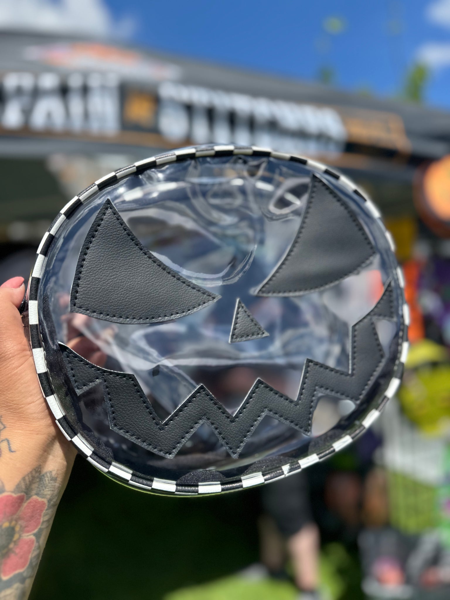 Concert bags just got a lot cuter with these Clear Pumpkin bags. These come with a black adjustable strap with Black hardware . Measuring approximately 11 x 10 1/2 x 3 inches.