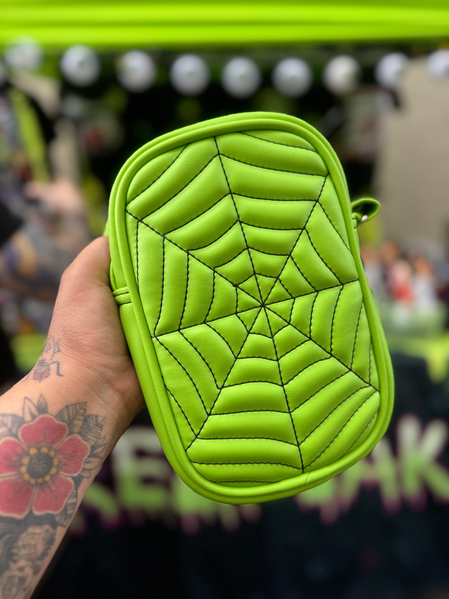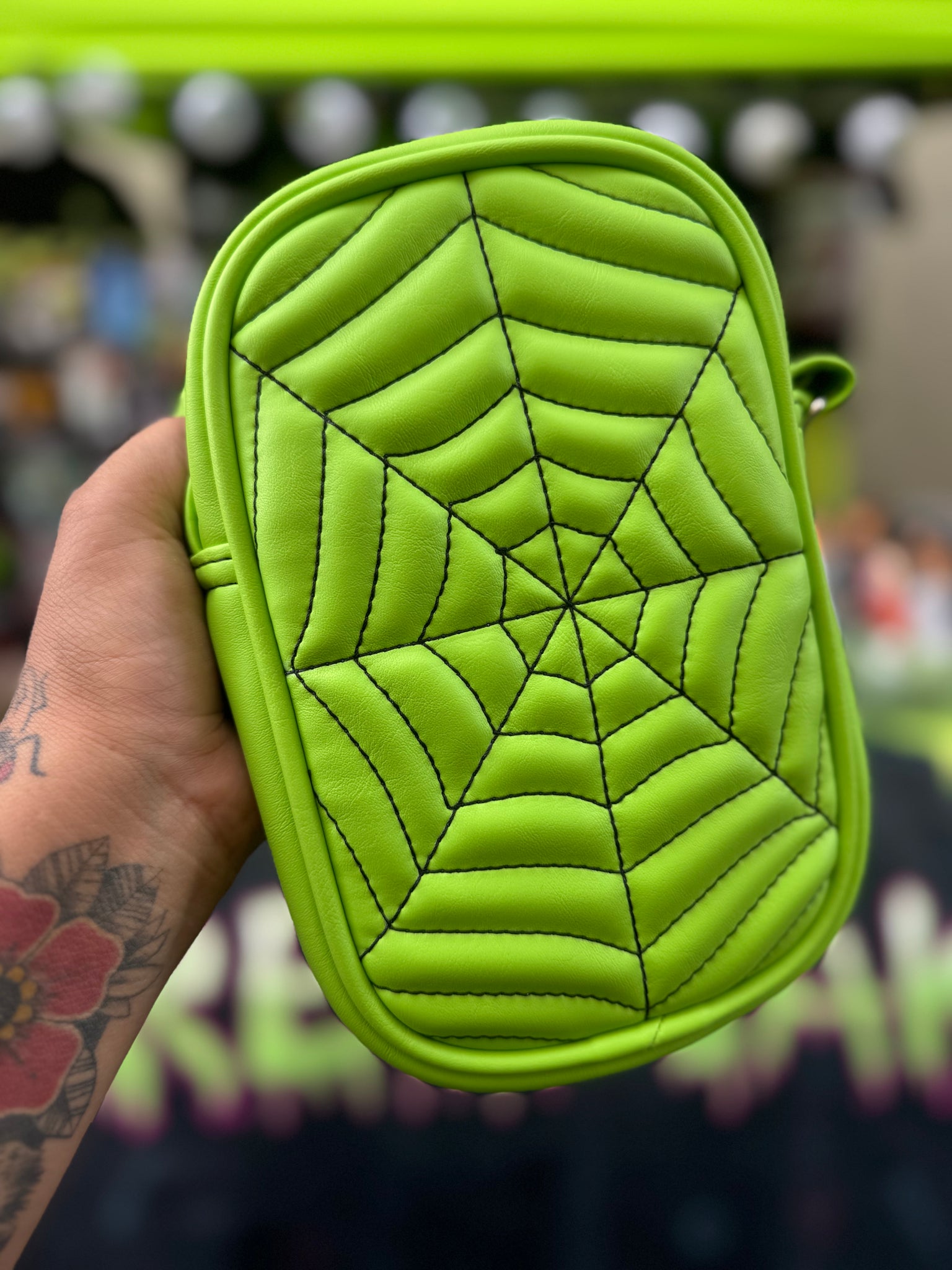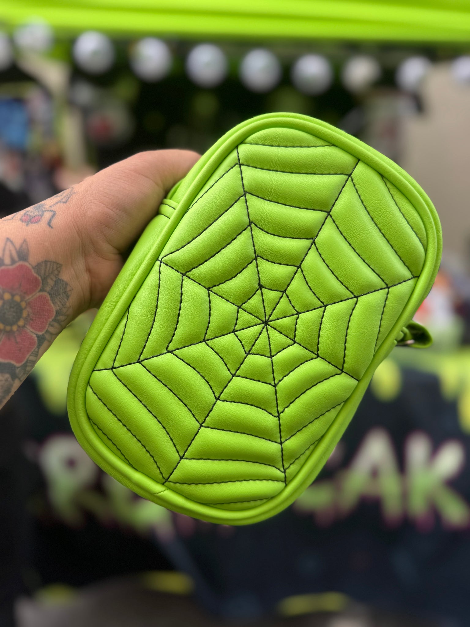 These are made with lime Green and Black spiderwebs and include a long Black strap with chrome hardware.