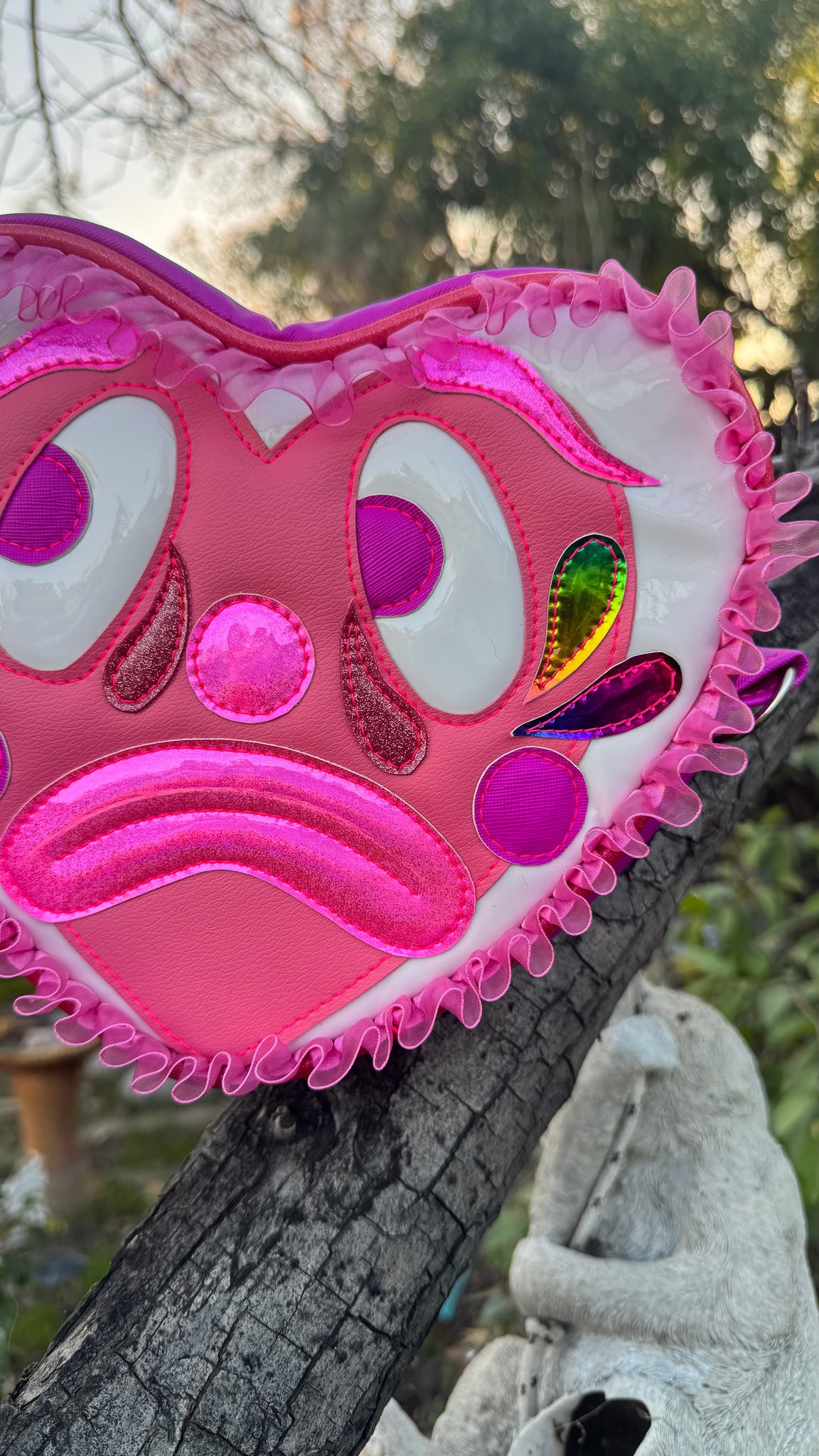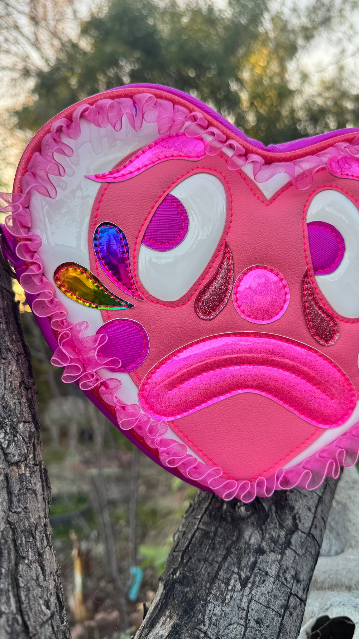 Our Sad Clown Heart features different shades of Pink Colors with Rainbow Clown tears. Attached black adjustable cross body Straps and Measures at approximately 10x9x3
