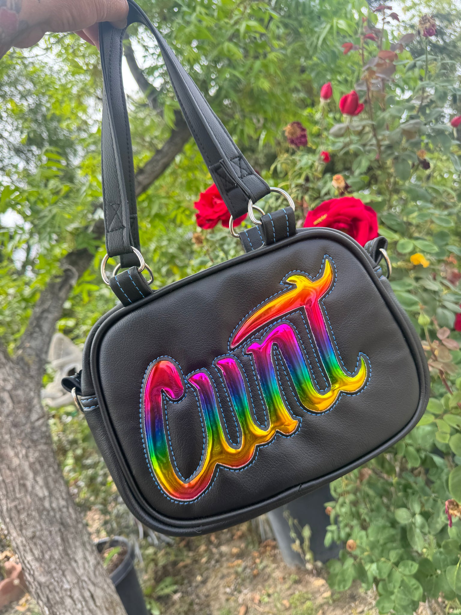 Our Mini C*nt Handbag Features a black handbag with your choice of Material for the words, these feature two mini handbag straps and a long crossbody strap in grey.
