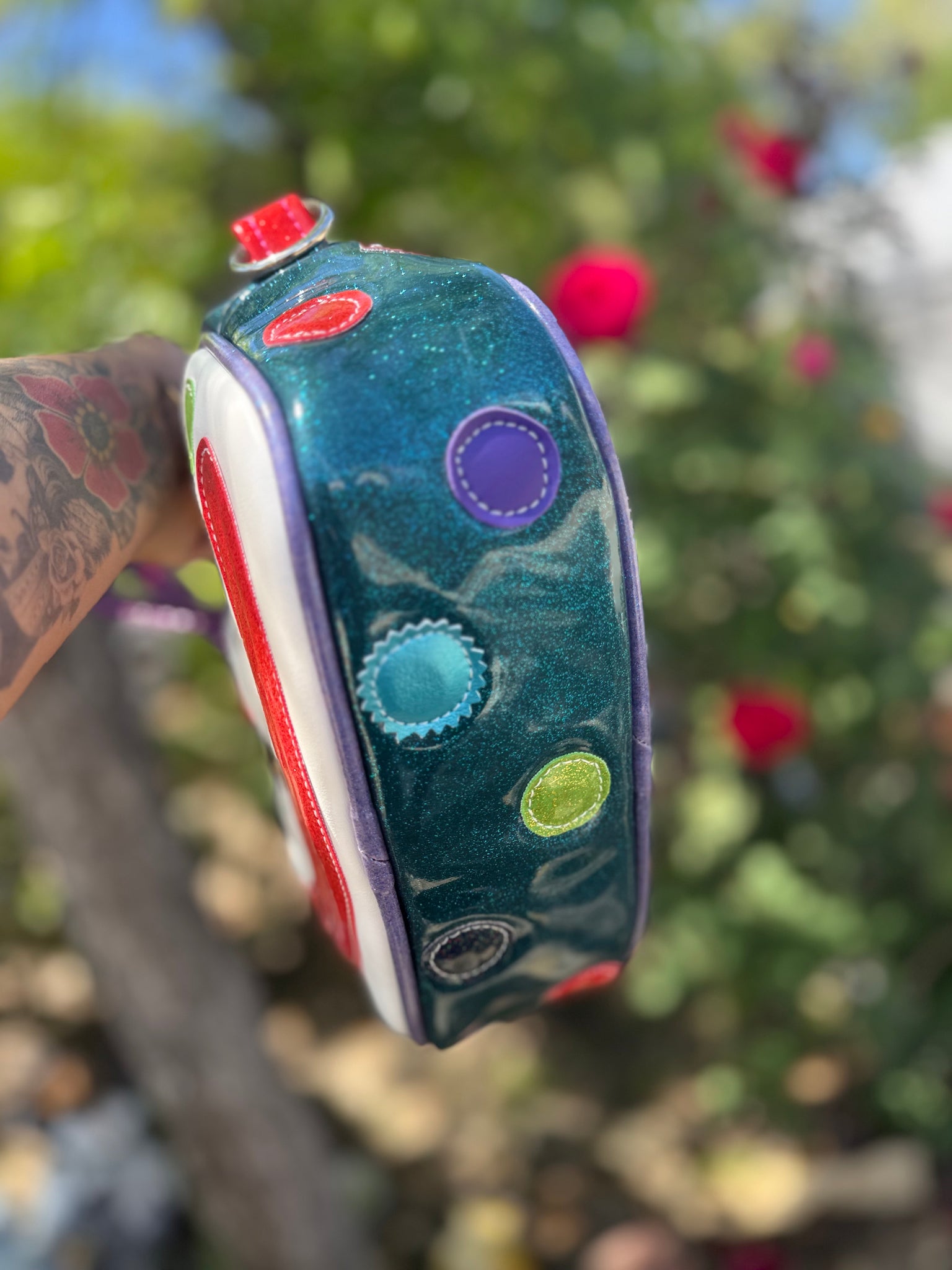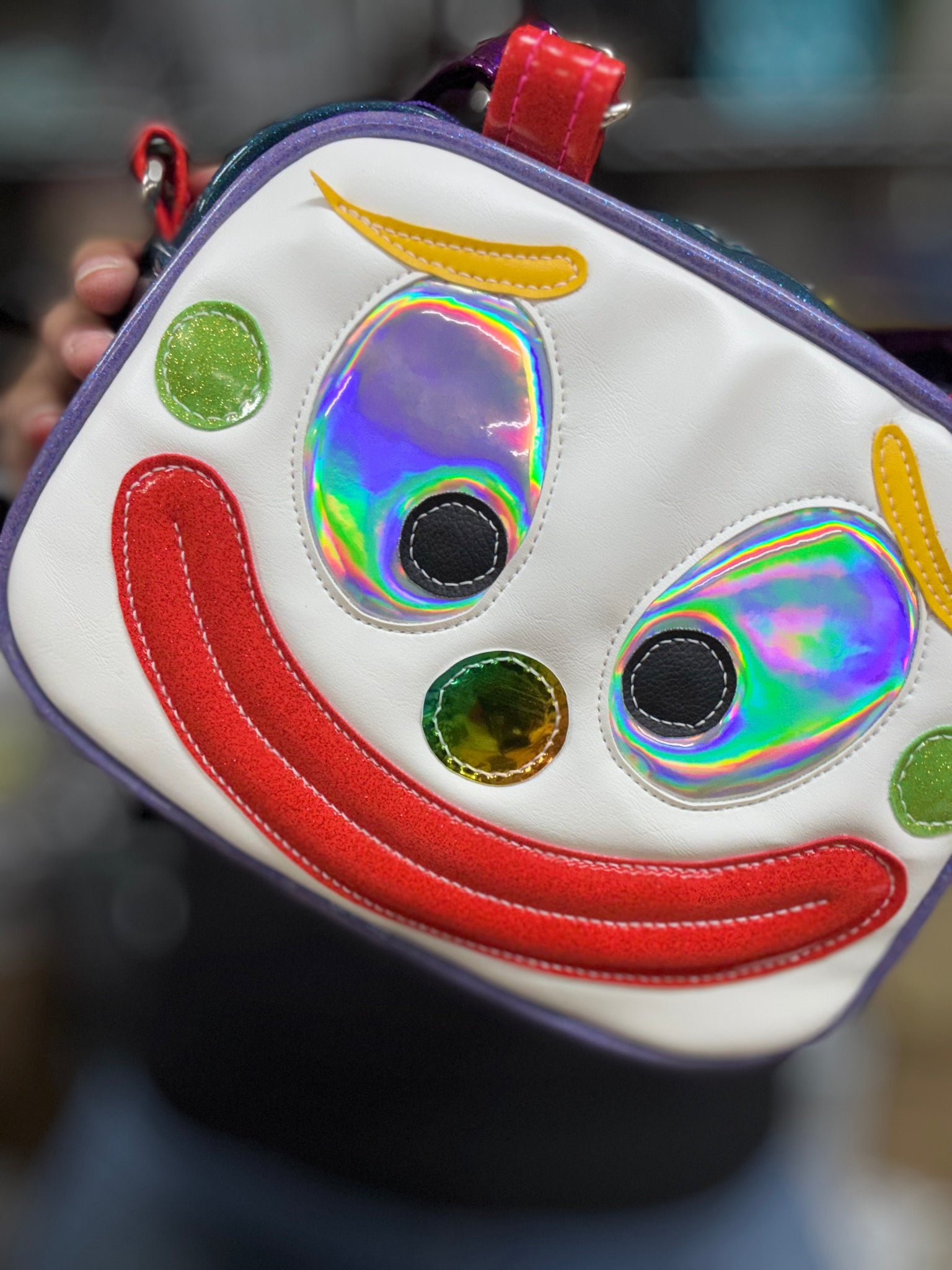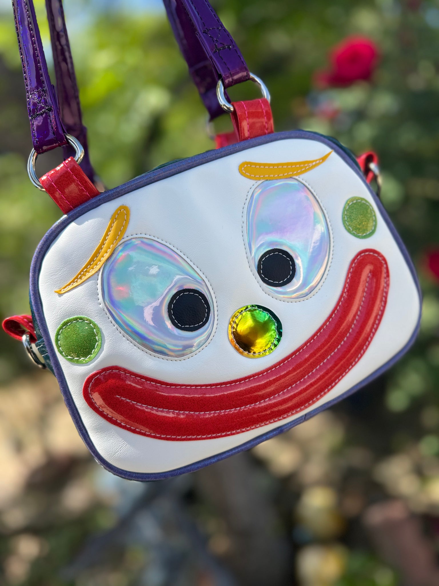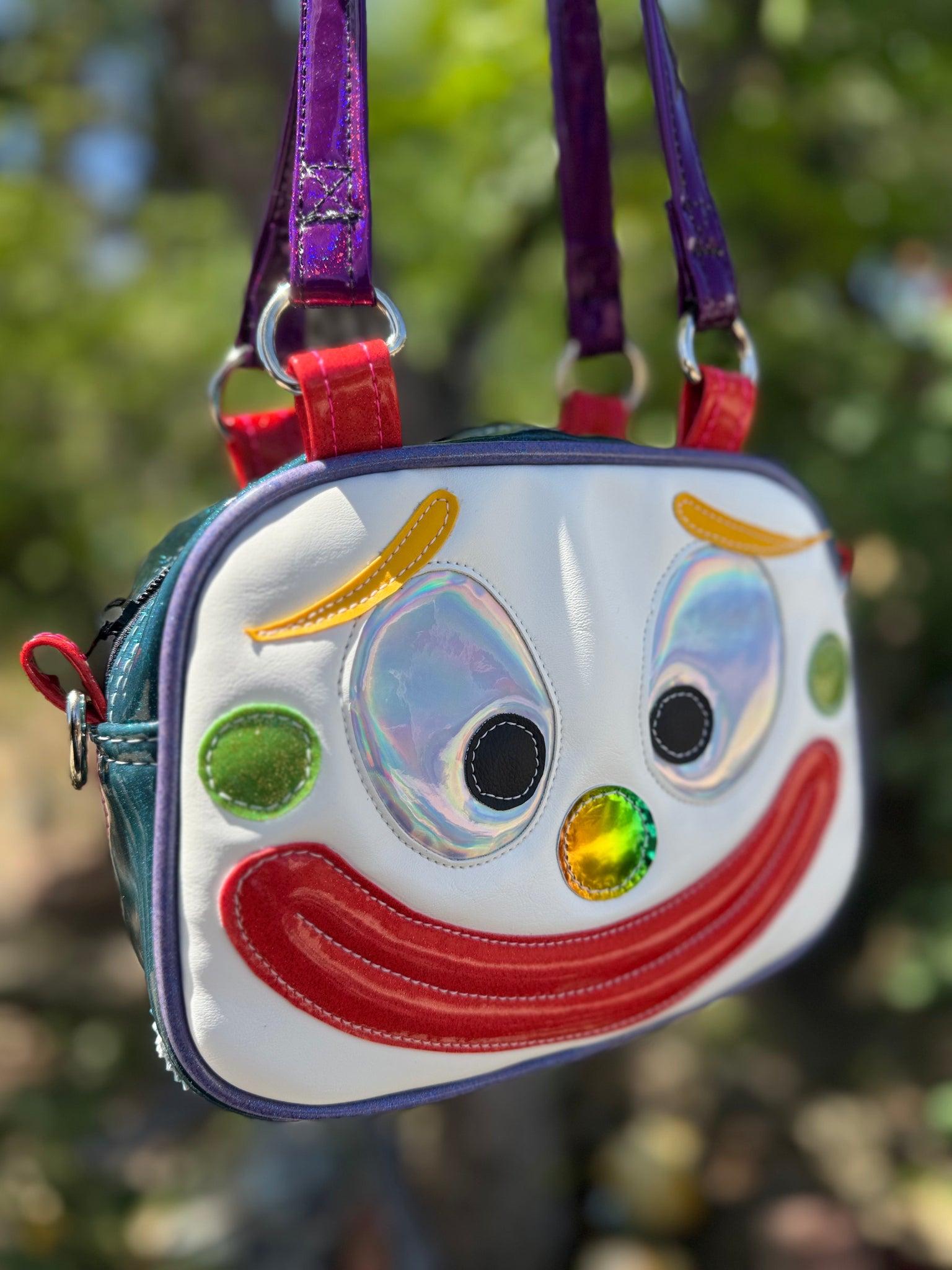 Our Mini Happy Clown Handbag Features a Teal Glitter handbag with an array of rainbow colors , the back features springtime cutouts and the body of the bag has random colorful polkadots. No two Bags will look the same! these feature two mini handbag straps and a long crossbody strap in grey.