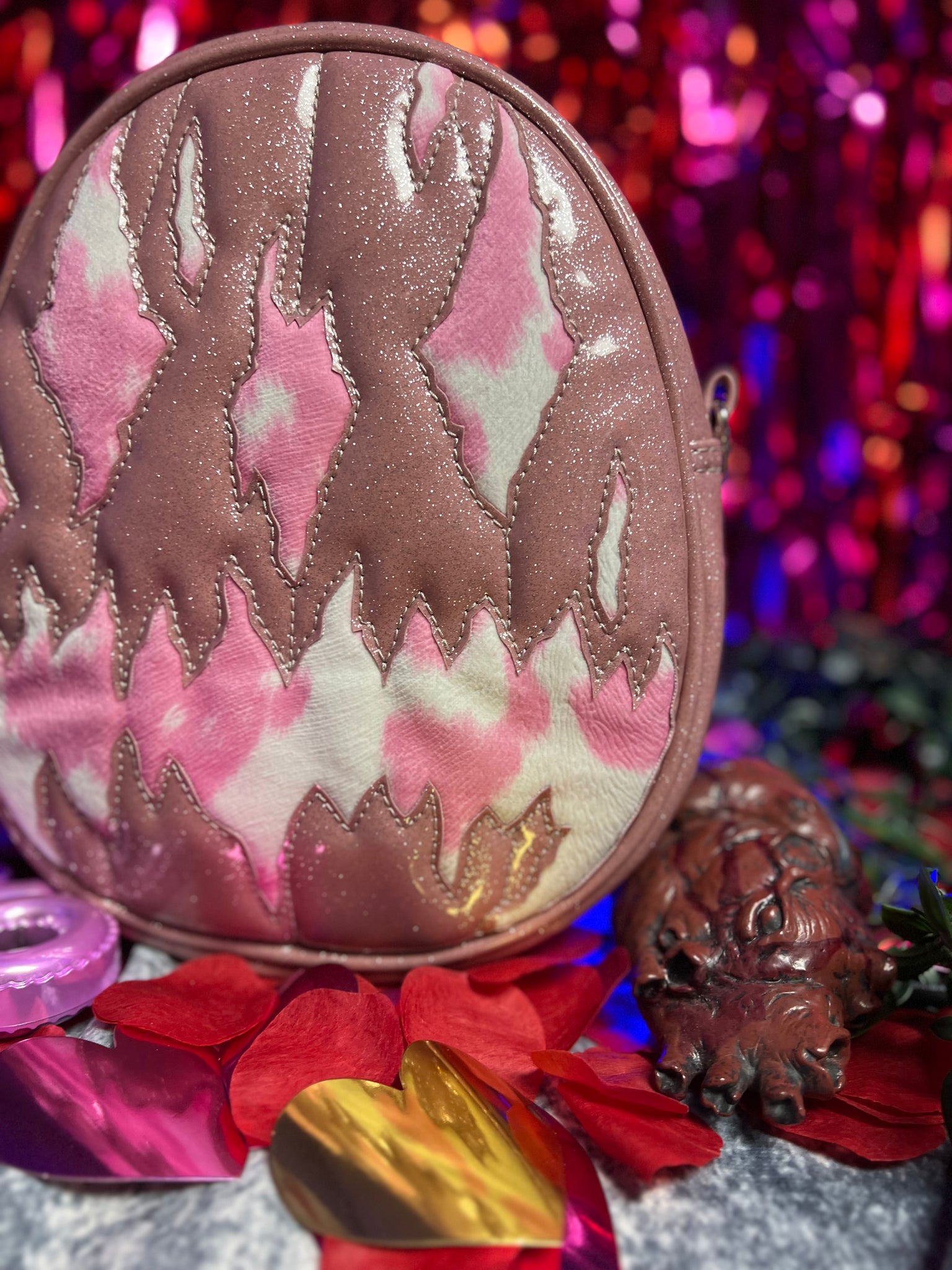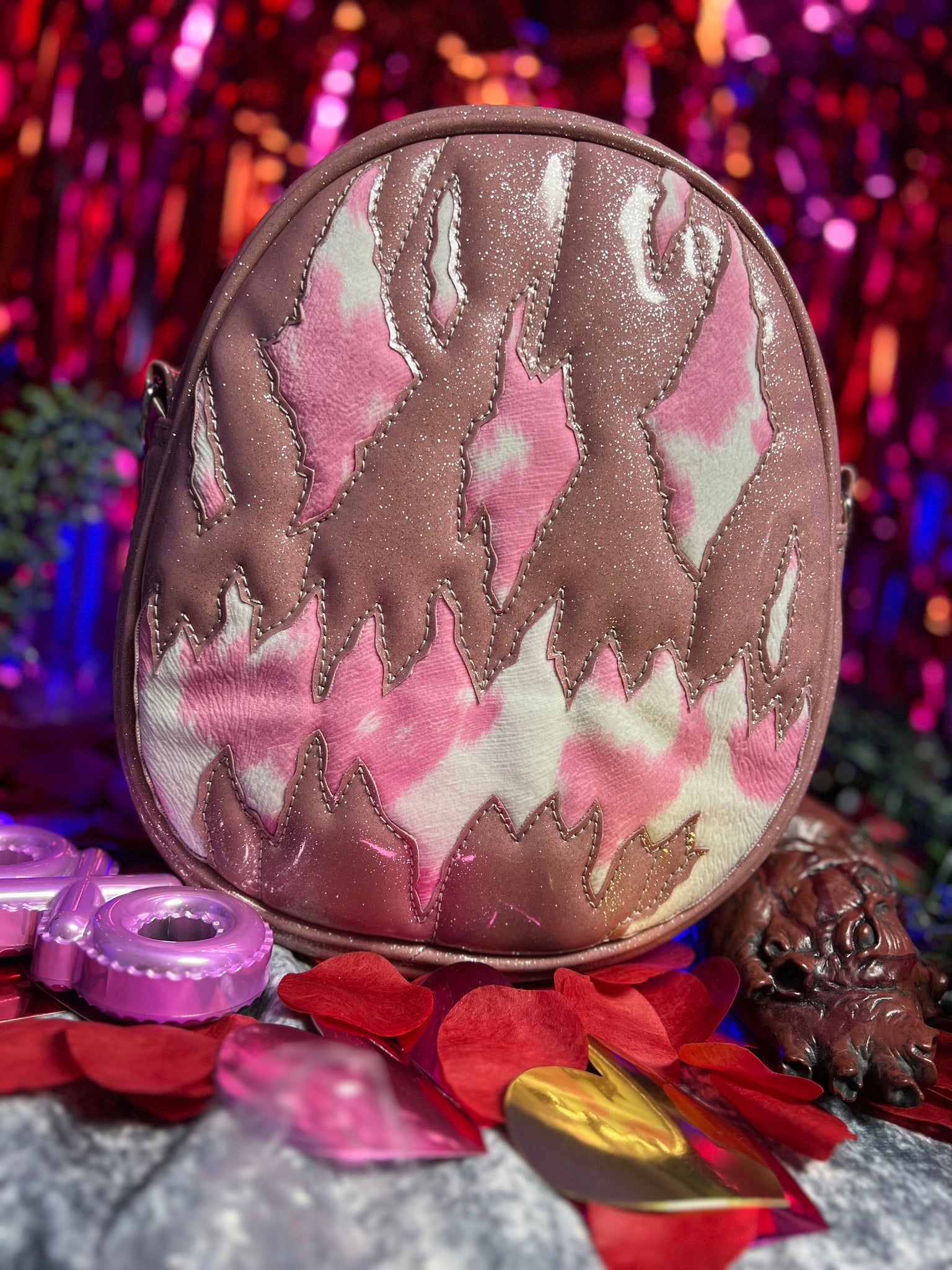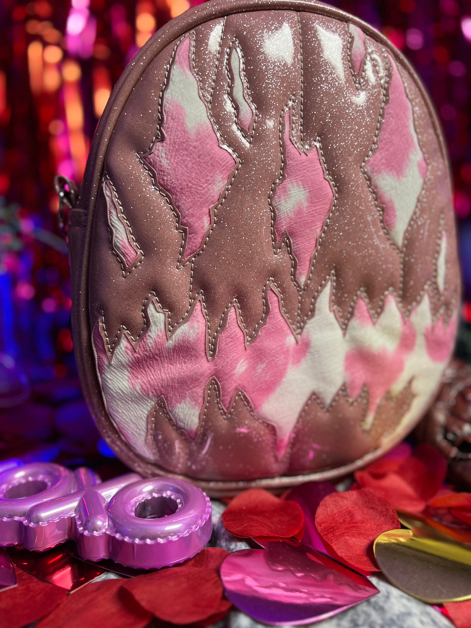 Our unique We stay Creepy oval design is made with Pink and Iridescent Glitter Purple, open pocket inside, black adjustable strap with sturdy hardware.