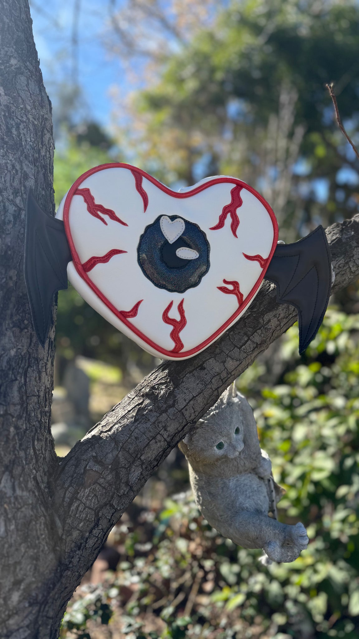 Our Flying Eye Heart features a Blood shot Eyeball in a heart shape with two Bat wings attached. Attached black adjustable cross body Straps and Measures at approximately 10x9x3