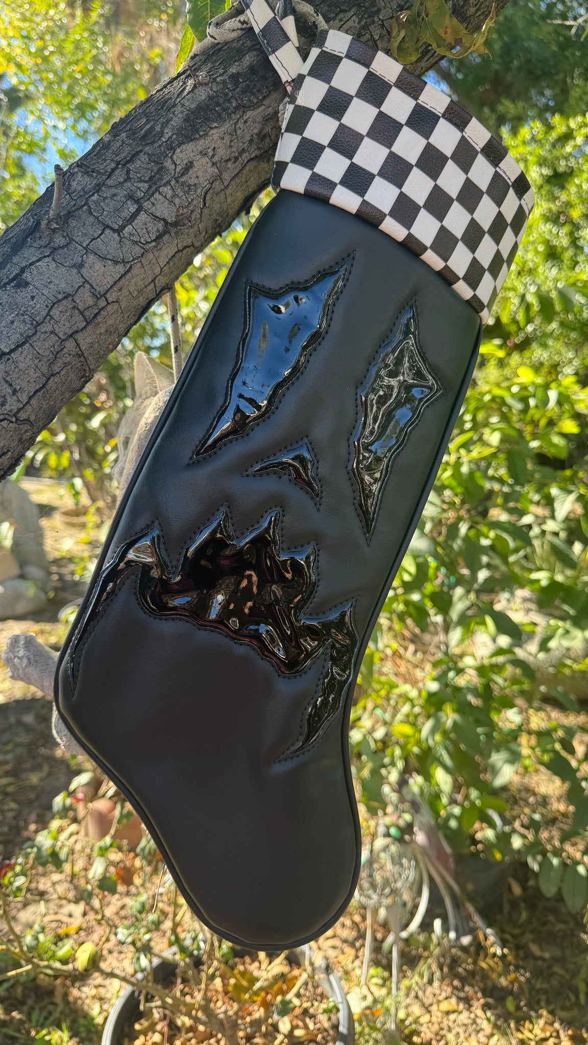 This Stocking is made with  all black and checkered trim! All stockings require a signature upon delivery