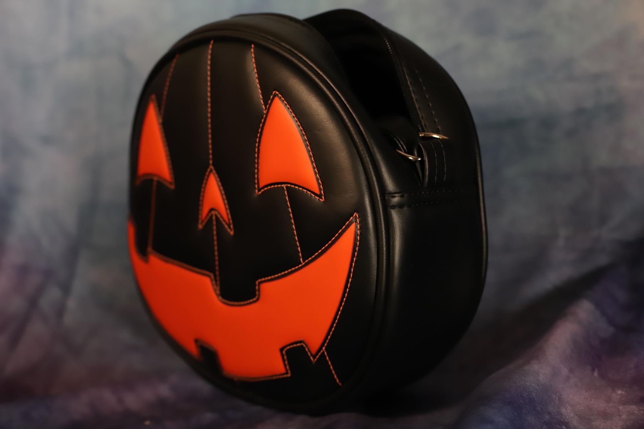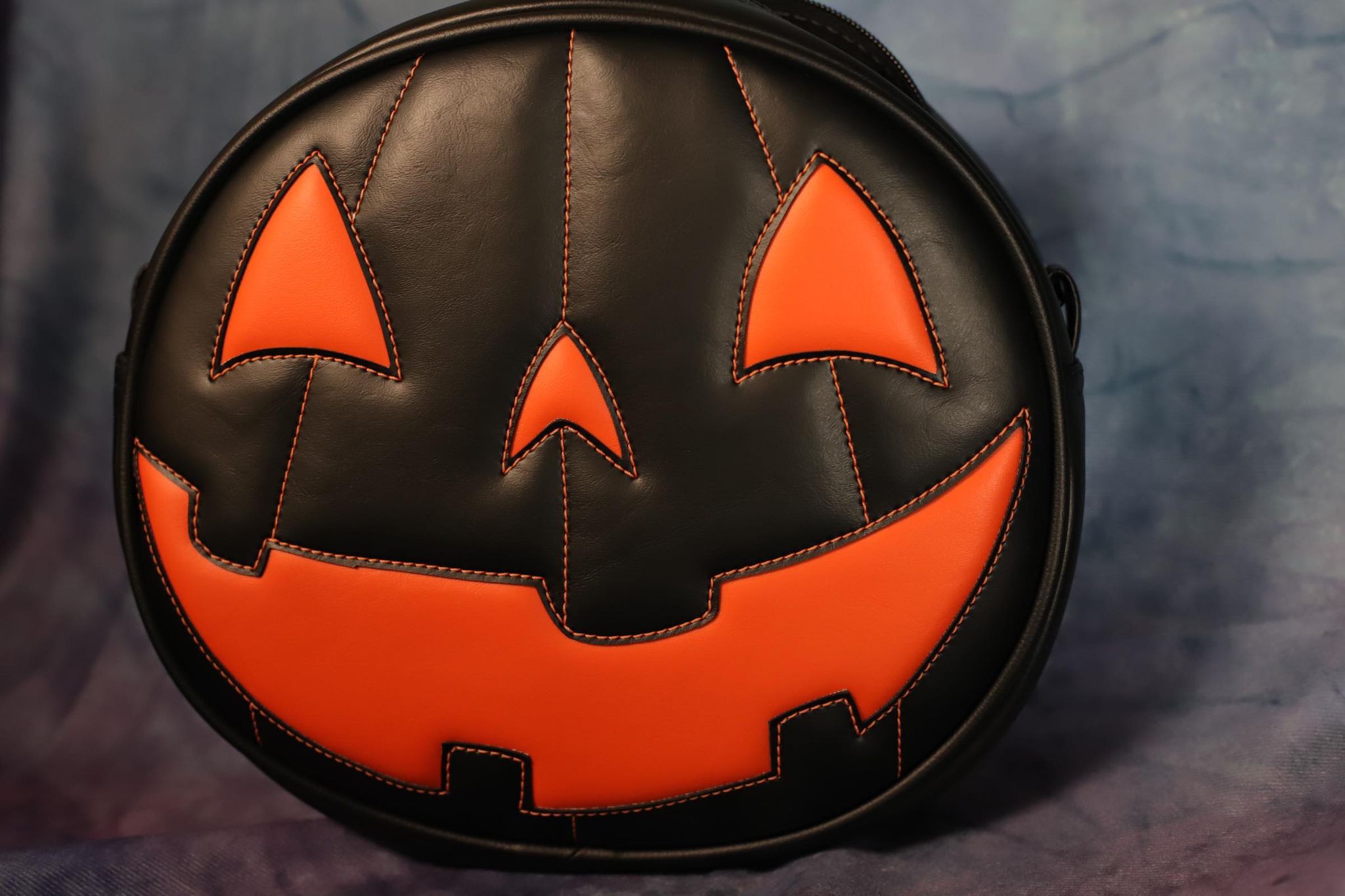 Our Original Black and Orange Happy Face Bags are back. With a pocket inside, Black Lining and black adjustable strap with chrome hardware. Orange stitching makes this bag design pop.  Measuring approximately 11 x 10 1/2 x 3 inches